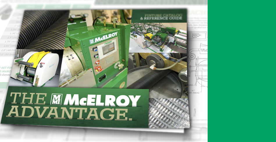 The McElroy applied tube finning machine is a miniature high speed rolling mill synchronized with the rotation and advance of the tube. Quick change, steady rest input and output racks, allow the tube to rotate at up to 3000 RPM for 1" tube. Strip is fed to the machine from a payoff table beneath the Bare Tube Rack or from a free standing oscillating coil payoff system.
